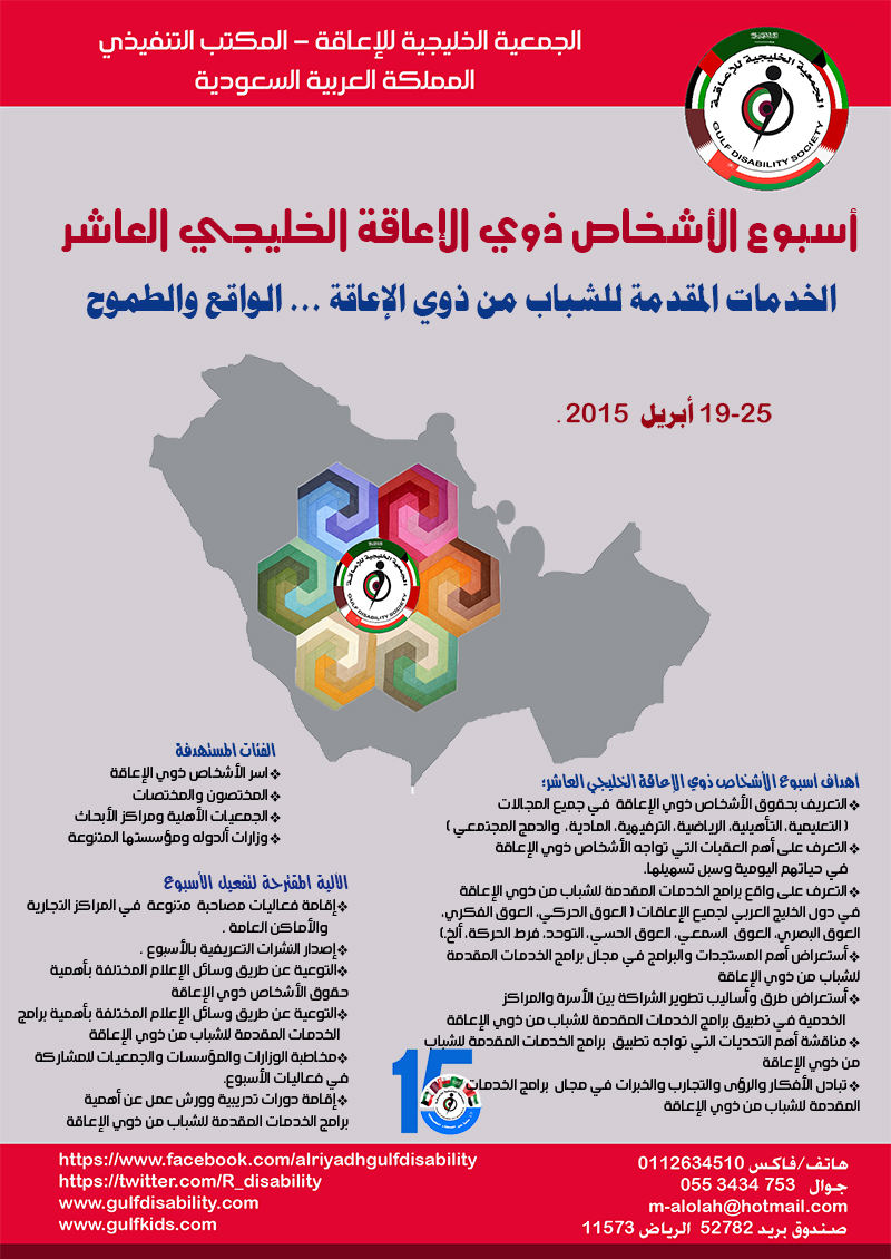 تحتفل الجمعية الخليجية للإعاقة – المكتب التنفيذي بالرياض بالتعاون مع المجموعة السعودية لدعم مرضى الصلب المشقوق باليوم العالمي للأشخاص ذوي الإعاقة في 3-6 ديسمبر 2014 م الموافق 11 - 14 صفر 1436 هـ، بالعديد من الفعاليات المجتمعية، تحت شعار « التنمية المستدامة : عهد التكنولوجيا »، والذي يرمي إلى نشر المفاهيم الخاصة وحقوق ذوي الإعاقة، واستخدام التكنولوجيا لإزالة المعوقات لخلق مجتمع شامل متاح للجميع، وتعبئة الجهود من أجل بلوغ الهدف المتمثل في تمتع الأشخاص بحقوقهم ومشاركتهم في المجتمع. المزيد… بتاريخ: الأحد 23-11-2014 06:36 مساء الزوار: 2358 التعليقات: 0