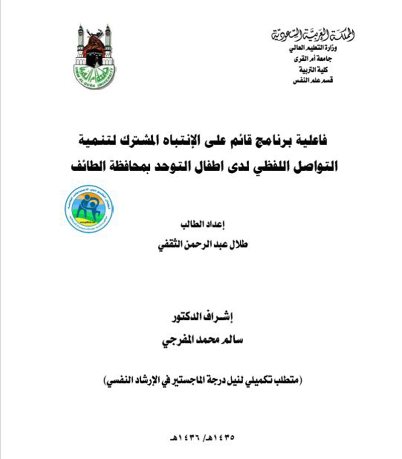 فاعلية برنامج قائم على الإنتباه المشترك لتنمية التواصل اللفظي لدى اطفال التوحد بمحافظة الطائف طلال عبدالرحمن الثقفي